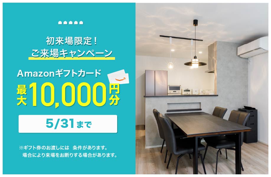 ※初回来場で5,000円(全ての条件を満たしたお客様)、2回目来場+事前審査提出で5,000円とさせていただきます。(完成見学会の場合は初回来場の5,000円分のみとなります)